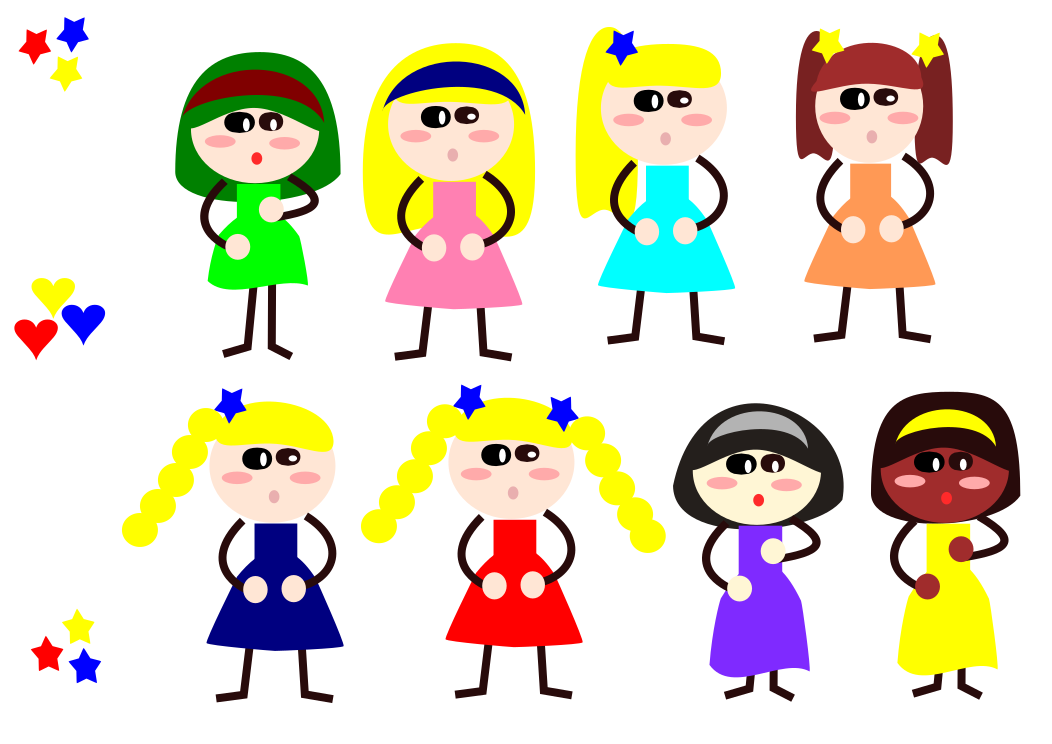 This features a collection of eight different stick figures, each representing a unique woman. Each figure has distinct hair styles and colors, showcasing the diversity among these characters. They are all standing in various positions, with some closer to the foreground while others are further back. This creative display of women's images is likely meant to represent a variety of individuals or to serve as an artistic representation of different types of people.