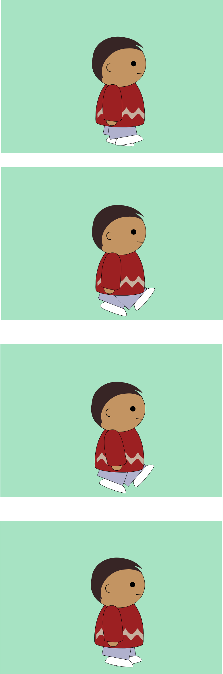 This is a collage of four pictures featuring the same character, a young boy wearing a red shirt. In each picture, he appears to be walking or sitting in different positions. The images are arranged side by side, creating an animation effect that showcases the progression of the character's movement. This type of image can be used for various purposes such as storytelling, educational materials, or even as a simple visual representation of a character's journey through a scene.