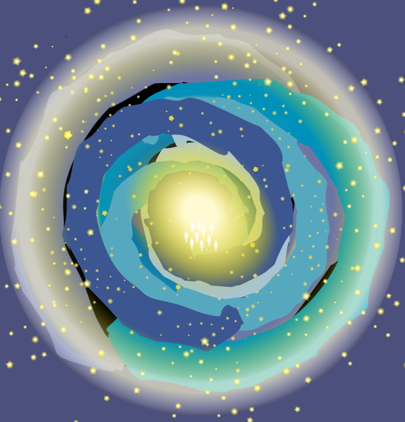 This features a large, colorful circle with a blue background and yellow stars. Inside the circle, there is an illuminated center that appears to be a bright light source. This central light source creates a captivating visual effect as it shines through the various layers of the circle. The combination of the vibrant colors and the glowing center make this image visually striking and unique.