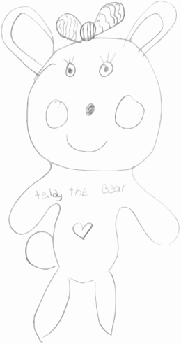 This features a drawing of a teddy bear, which is a popular comfort toy for children. This particular teddy bear has been given the name Teddy the Bear and is wearing a heart on its chest. The drawing appears to be hand-drawn, giving it a unique and personal touch. The teddy bear's design includes a bow around its neck, adding an extra element of charm to the image. Overall, this drawing captures the essence of a beloved childhood toy that brings comfort and joy to those who encounter it.