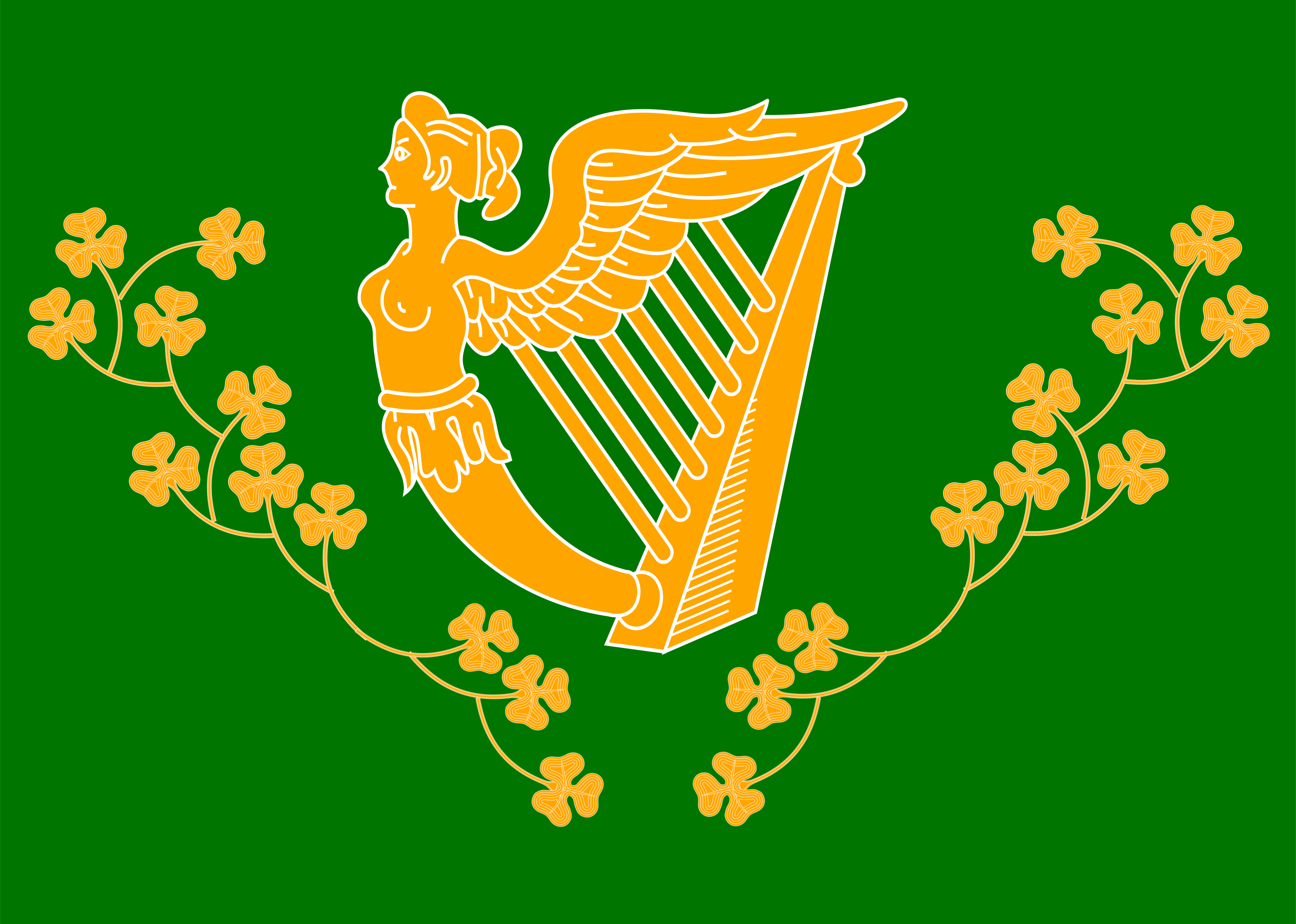 This features a green and yellow flag with an angelic figure, possibly a harp lady, adorned in the center. She is surrounded by numerous clovers, which are scattered throughout the flag's design. The overall appearance of the flag gives it a unique and artistic touch, making it stand out as a distinctive symbol.