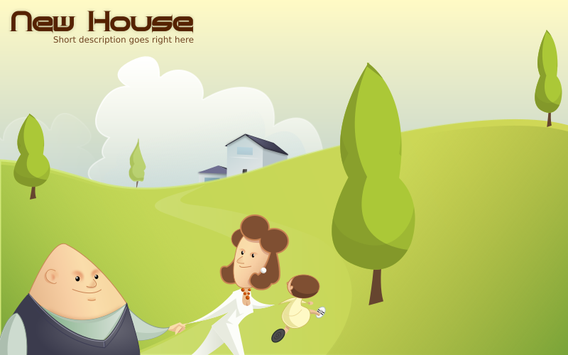 This depicts a man and woman walking together on green grass, with the woman holding a baby. They are heading towards a house in the background. In the top left corner of the image, there is a caption that reads "new house." This suggests that they might be moving into their new home or have just arrived at this location. The scene appears to be set in a peaceful and serene environment, with trees surrounding them as they walk along the path.