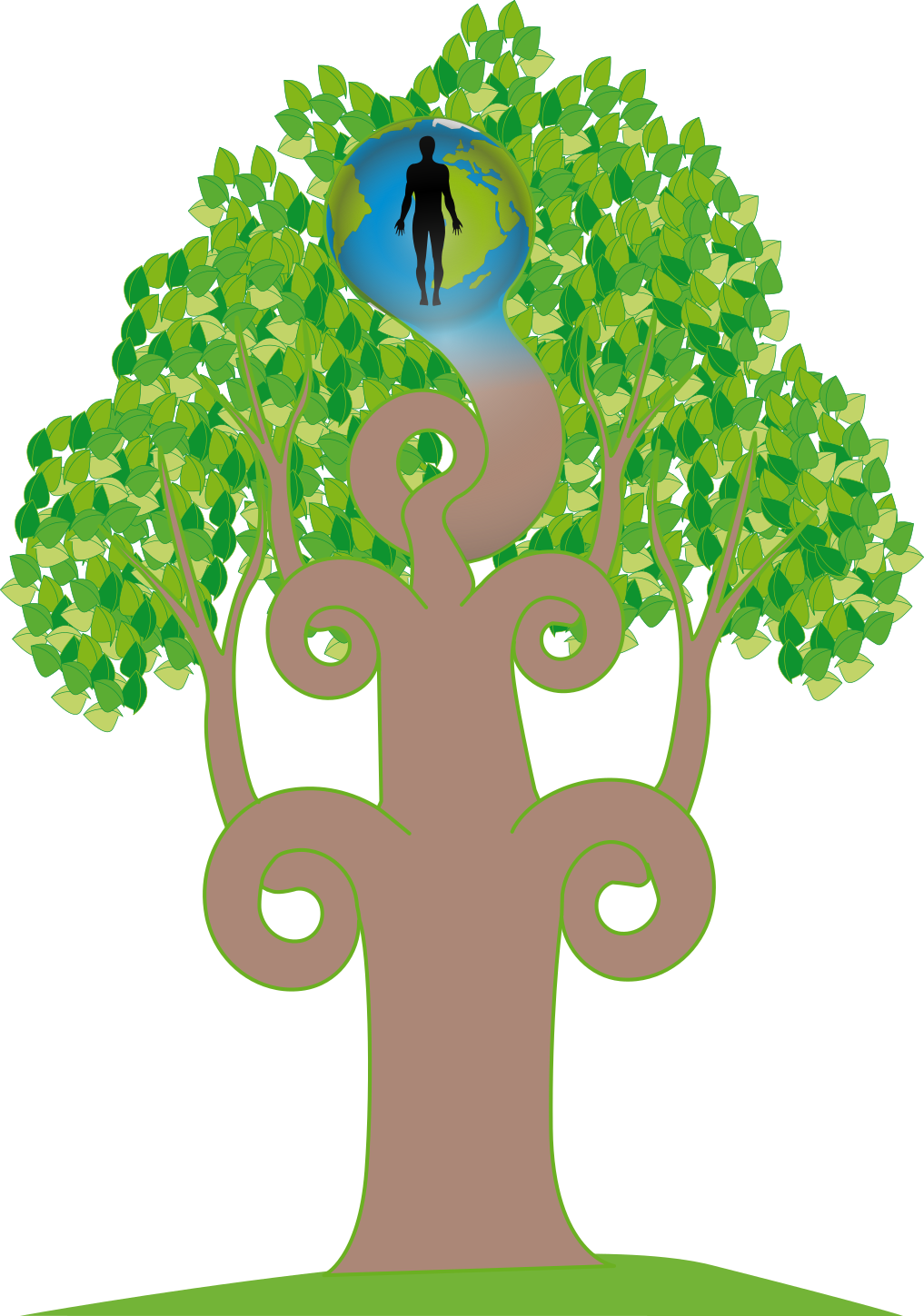 This features a tree with curved branches and a brown stem, which is adorned by an Earth globe on top. A person can be seen standing in the center of the tree, surrounded by leaves that create a lush green atmosphere. The scene appears to be a unique artistic representation of the connection between humans and nature, as well as the importance of preserving our environment for future generations.