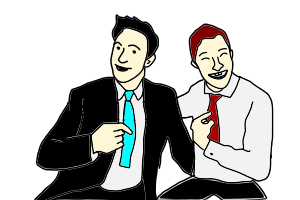 This features two men dressed in business attire, sitting next to each other on a couch. Both of them are wearing ties and appear to be smiling as they point at themselves. One man is positioned closer to the left side of the frame while the other is situated more towards the right. They seem to be enjoying their time together in this casual setting, possibly discussing work or sharing a light-hearted moment. The scene captures a friendly and relaxed atmosphere between these two professionals.