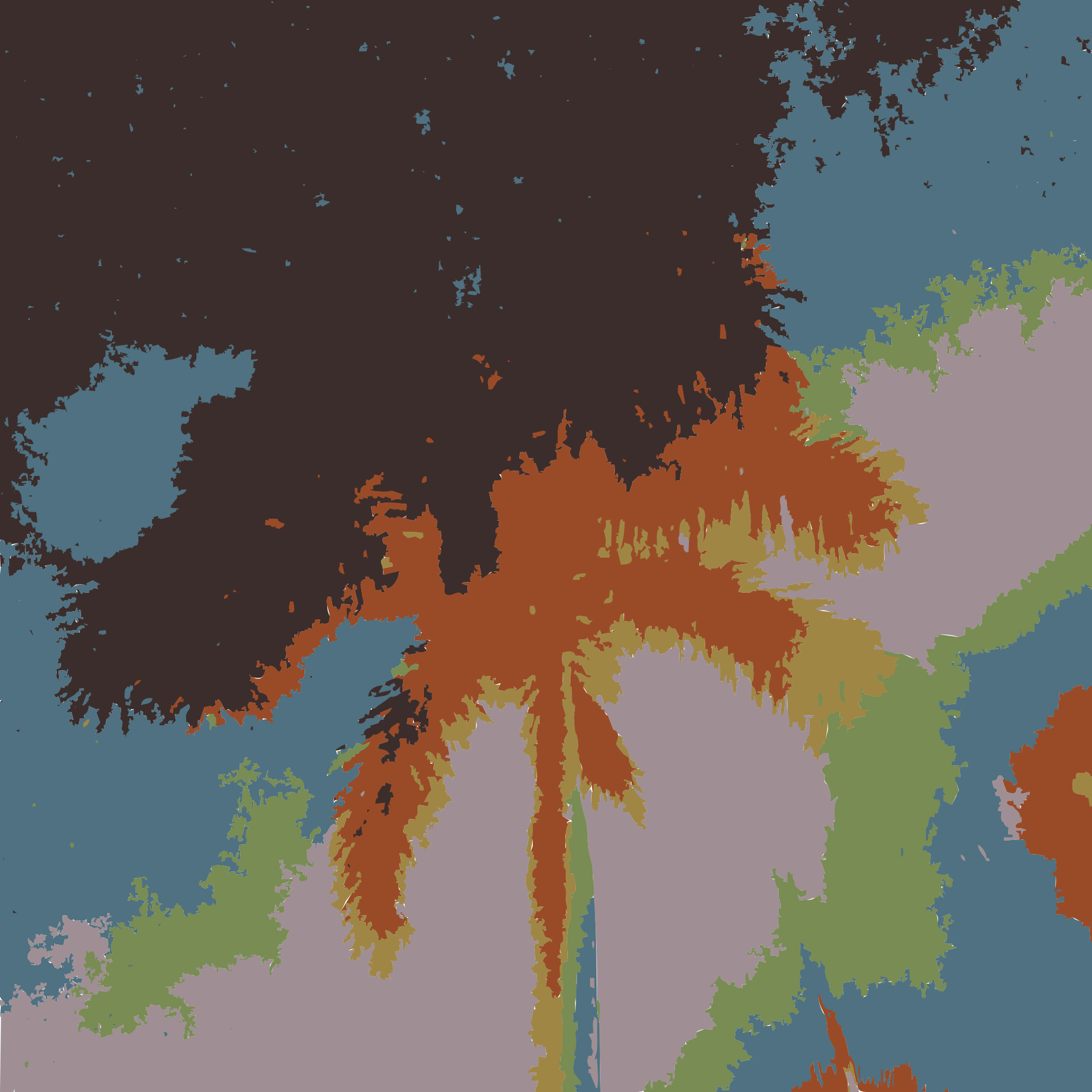 This features a tree with a large, colorful palm frond. The frond is prominently displayed in the center of the picture and appears to be the main focus of the scene. The tree itself has a brownish hue, giving it an aged appearance. In addition to the main tree, there are several other trees visible in the background, adding depth and variety to the image. Overall, the scene is vibrant and full of life, with the palm frond being the centerpiece.