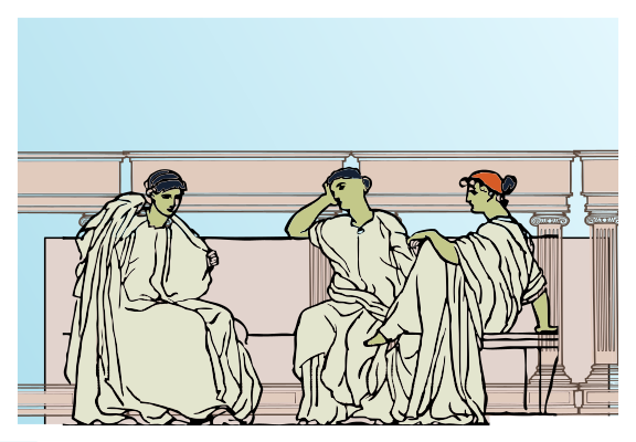 This features three women dressed in flowing robes, sitting on a bench and engaging in conversation. They are positioned next to each other, with one woman on the left side of the bench, another in the middle, and the third woman on the right side. Each woman has her own unique appearance, adding character to the scene. The setting appears to be a room with Roman arches, which adds an element of sophistication and elegance to the atmosphere. The women are seated comfortably on the bench, creating a sense of relaxation and camaraderie among them. Overall, this image captures a moment of connection and conversation between these three beautifully dressed ladies.