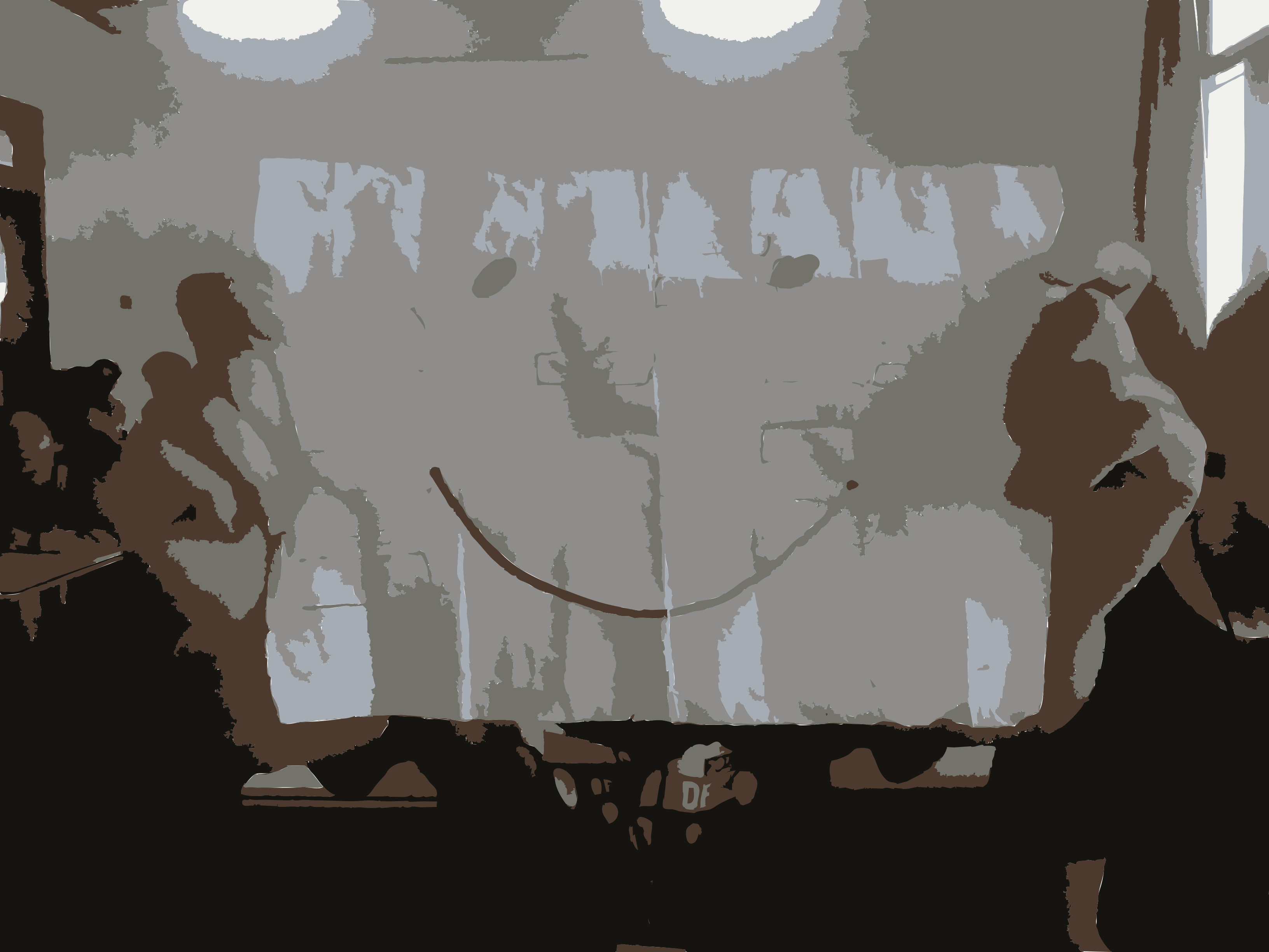 This features a large, smiling face with a toothy grin. It appears to be an artistic representation of a train or a vehicle, as it is described as a "train face" and has a "smile." The face is the main focus of the image, occupying most of the frame.