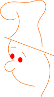 This features a cartoon character, possibly a wizard or an elf, with a red nose and a pointy hat. The character is wearing a white shirt and appears to be peeking out from behind a curtain. The drawing of the character is orange in color, giving it a vibrant appearance. The cartoon figure seems to be part of a larger scene or illustration, possibly depicting a magical world or holiday theme.