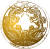 This features a round, ornate design with two dragons facing each other. One dragon is positioned on the left side of the circle and the other is on the right side. In between these two dragons, there are several birds scattered throughout the design. Some of the birds can be seen in the top half of the circle while others are located near the bottom half. The overall effect creates a visually striking and intricate pattern that showcases the artistic skill involved in creating this piece.