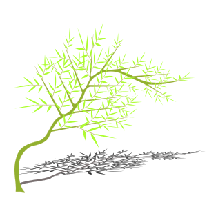 This features a green tree with long, thin branches that are swaying in the wind. The tree is situated on a white background, which creates a striking contrast between the tree and its surroundings. The branches of the tree extend outwards, creating an interesting visual effect as they seem to reach towards the viewer. This artistic representation of the tree captures the beauty of nature and the delicate balance between the tree's structure and the wind that shapes it.