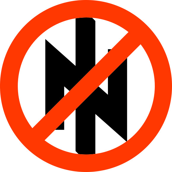 This features a red and white sign with the letter "N" crossed out in black. This symbol is commonly associated with the Ukrainian language, where it represents the word "no." The sign appears to be an anti-fascism symbol, indicating that it is used to object to fascist ideologies or actions. The bold design of the sign makes it easily recognizable and serves as a powerful visual representation of its message.