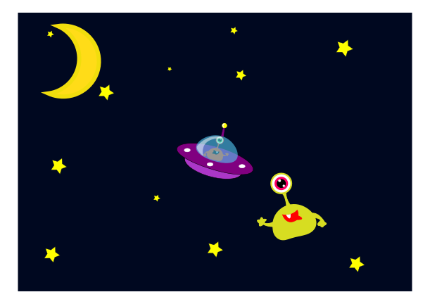 This features a cute alien waving with one eye, and it is positioned next to a small purple spaceship. The scene takes place in the night sky, where numerous stars are visible around them. The alien appears to be enjoying its time on this unique spacecraft, creating an interesting and playful atmosphere.