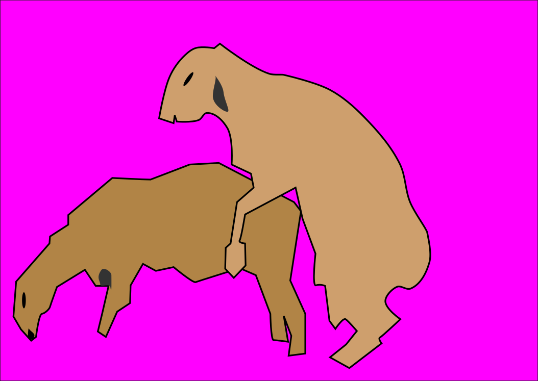 This features a brown sheep standing on top of another sheep, with the first sheep being ridden. This unusual scene is depicted in a cartoon-like style, giving it an amusing and playful appearance. The two sheep are positioned close to each other, creating a sense of intimacy between them. The image also includes a dog standing on top of one of the sheep, adding another element of surprise and humor to the scene.