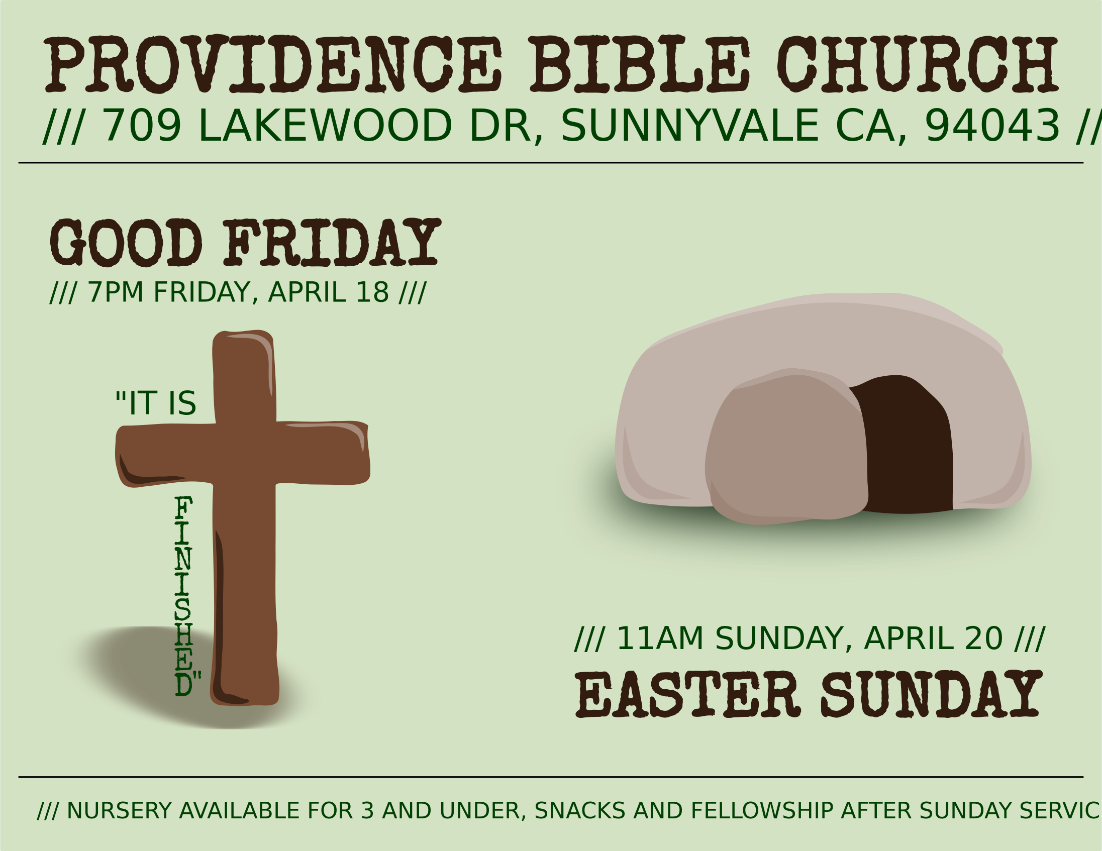 This features a flyer advertising the Providence Bible Church's Easter Sunday event. The flyer is green and white, with a cross prominently displayed on it. The church is located at 790 Lakewood Dr., Sunnyvale, CA 94086. The flyer also includes information about the event, such as the date (April 29th) and time (1:00 pm). Additionally, there are two other dates listed on the flyer - April 15th and April 22nd - which may be related to the same event or different events.