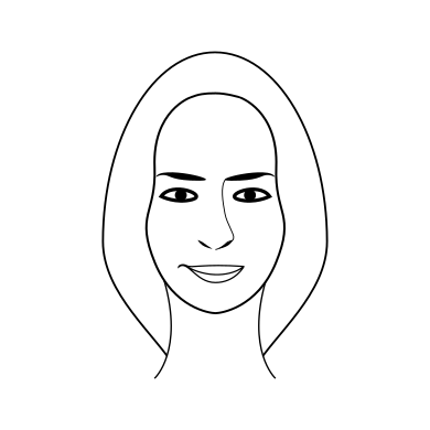 This is a black and white drawing of a woman's face. She has dark hair, which appears to be straight and smooth in texture. Her eyebrows are drawn as two distinct lines above her eyes, giving the impression that she has arched brows. The nose on her face is small and slightly upturned at the tip. The lips of the woman are closed, but they appear to be full and pink. Overall, the drawing captures a close-up view of the woman's face with attention given to her features.