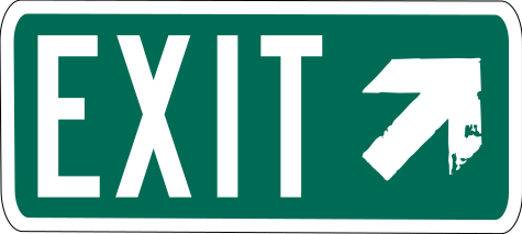This features a green exit sign with white letters, indicating the direction of an exit. The sign is placed on top of a white background, making it stand out clearly. The sign has a slightly faded appearance, giving it a vintage look. This exit sign could be found at various locations such as highways or interstate roads, guiding drivers towards their desired exits.