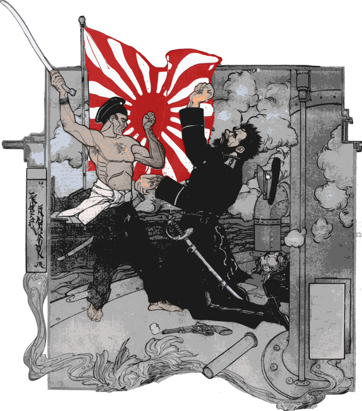 This depicts a scene from the Russo-Japanese War, which took place between 1904 and 1905. In this particular moment, two men are fighting each other with swords while holding flags in their hands. One of the men is wearing a black outfit, possibly representing Japan, while the other man appears to be from Russia. The scene captures the intensity of the battle as both men engage in hand-to-hand combat. The image also features several other elements that add depth and context to the scene. There are two bottles visible on the ground, which might have been used by the soldiers during the war. Additionally, there is a clock present in the background, possibly indicating the time of day or marking the duration of the battle. The combination of these elements creates an immersive visual experience that showcases the historical event and its impact on the two nations involved.