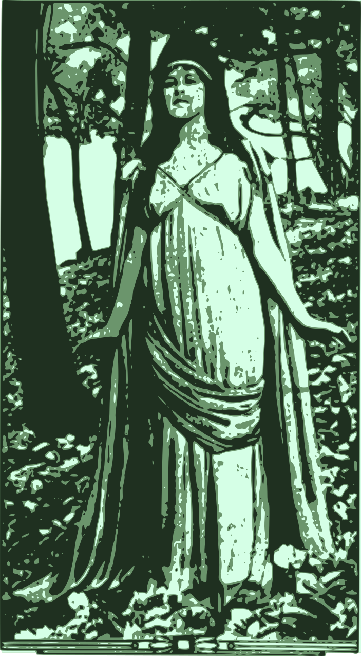 This features a woman dressed in a long green dress, standing in the middle of a forest. She appears to be walking through the woods and seems to be enjoying her time outdoors. The scene is depicted in black and white, giving it an artistic and timeless feel. The woman's attire suggests that she might be from a different era or perhaps dressed for a special occasion. Overall, the image captures a serene moment of solitude in nature.