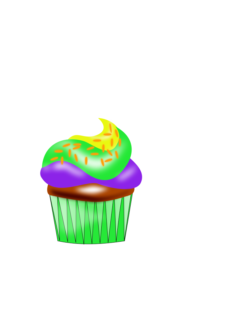 This features a colorful cupcake with an icing topping that includes yellow, green, and purple colors. The cupcake is adorned with sprinkles on top of the icing, adding to its visual appeal. The combination of these vibrant colors and the sprinkles make it an enticing treat for anyone who enjoys sweet treats.