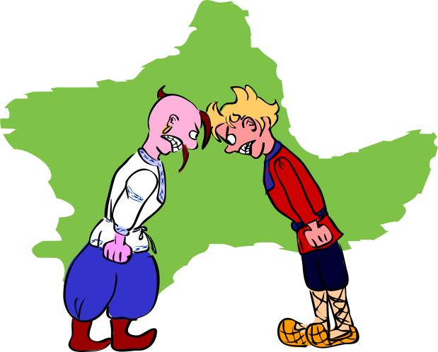 This features two cartoon characters, a man and a woman, standing next to each other with their mouths open. They appear to be engaged in an animated conversation or disagreement. Both characters are wearing colorful clothing, adding to the lively atmosphere of the scene. One character is dressed in red, while the other has on blue attire. The two figures seem to be the main focus of the image, with a map in the background and a clock visible near the top right corner.