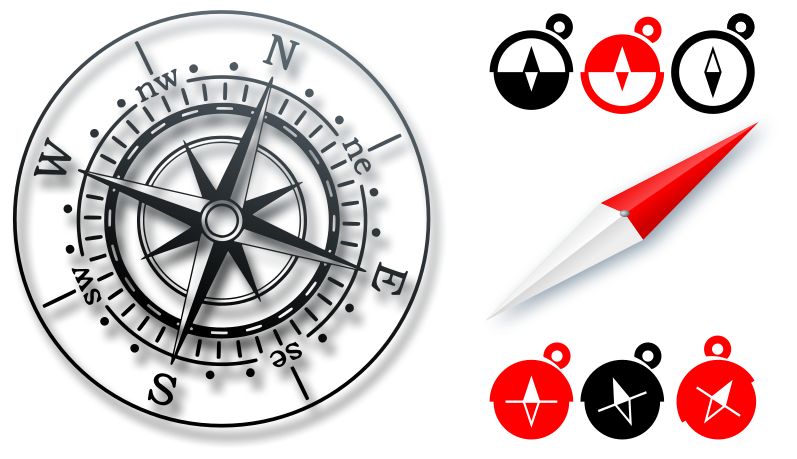 This features a compass rose with a red, white, and black design. It is surrounded by various icons that represent different directions on the compass. These icons include a clock face, a map pin, a globe, and an arrow pointing to the right. The compass itself has a silver appearance, giving it a sleek and modern look. Overall, this image showcases a combination of traditional and contemporary elements in its design.