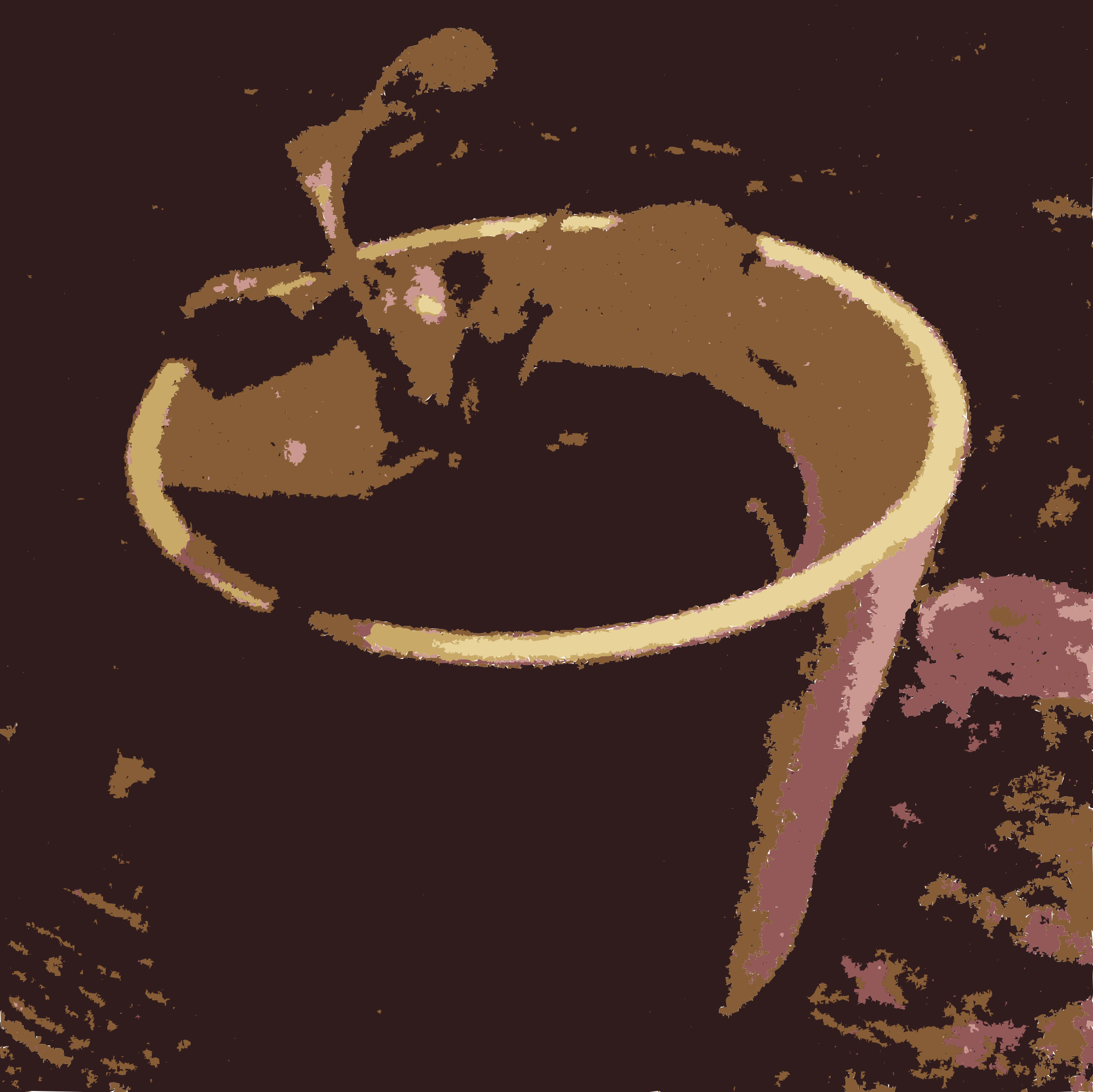 This features a brown cup sitting on top of a table. The cup appears to be dirty, possibly filled with dirt or other debris. It has a white top and is placed in the center of the scene. The overall atmosphere of the image seems somewhat dark, giving it an aged appearance.