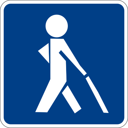 This features a blue sign with an illustration of a person walking and holding a white cane. This sign is likely meant to represent the visual impairment symbol, indicating that the area may have limited visibility or be designed for people with visual impairments. The sign's design is simple yet effective in conveying its message.