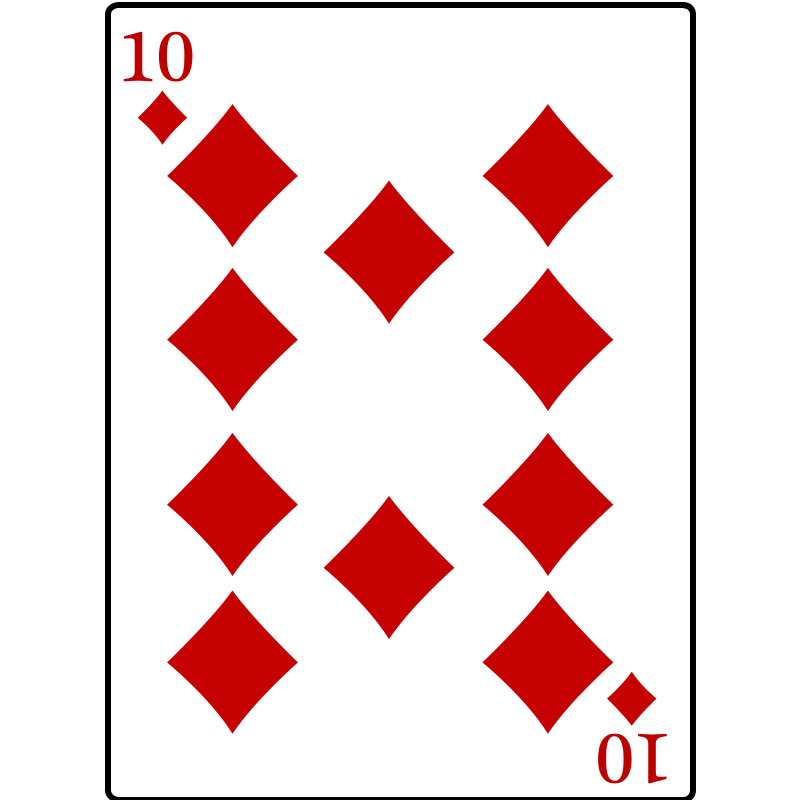 This features a deck of cards with the number 10 on it. The card is red and white, with a total of nine diamond shapes arranged in a square pattern. Each diamond shape has a red background and a white outline, creating an eye-catching design. The card appears to be part of a larger collection or set, as there are multiple cards visible in the image.