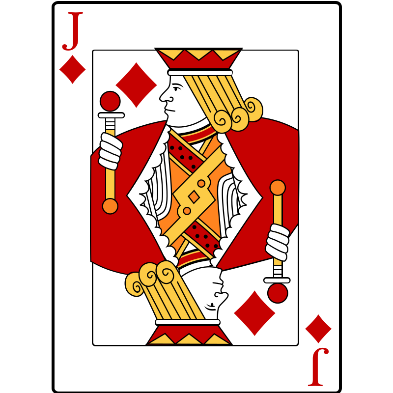 This features a colorful and intricate card deck, showcasing the Joker card. The Joker is depicted as a king with a crown on his head, holding two scepters in each hand. He appears to be wearing a red suit adorned with gold accents. The card is surrounded by various other cards, including multiple diamonds and hearts scattered throughout the scene. This unique design makes for an eye-catching and engaging deck of cards.
