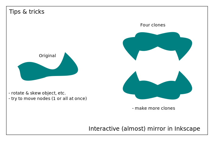 This is a diagram that shows the process of creating an interactive inkscape. It starts with a green and blue object, which is then rotated to create a new shape. This new shape is then used as a reference for cloning other shapes. There are four different shapes shown in total, each one being created from the original shape by rotating it. The final result is an interactive image that has been manipulated using various techniques such as mirroring and cloning.