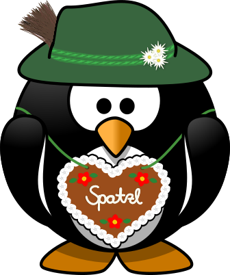 This features a cartoon illustration of a black and white penguin wearing a green Bavarian style hat. The penguin is holding a gingerbread heart with the word "spatzl" written on it, which appears to be a playful representation of a traditional German pastry. The penguin's attire and the heart with the word "spatzl" suggest that this illustration might have been created for a festive occasion or as a creative expression of cultural appreciation.