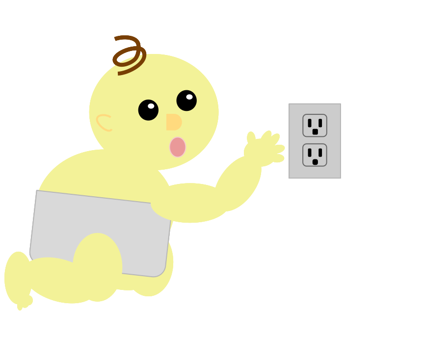 This features a cartoon baby wearing a diaper and reaching out to an electric socket. The baby is yellow in color, with its arms stretched out towards the socket. It appears as if the baby is attempting to interact with or play with the electrical device. The scene is likely meant to be humorous or whimsical, as it portrays a young child engaging with an adult-oriented object.