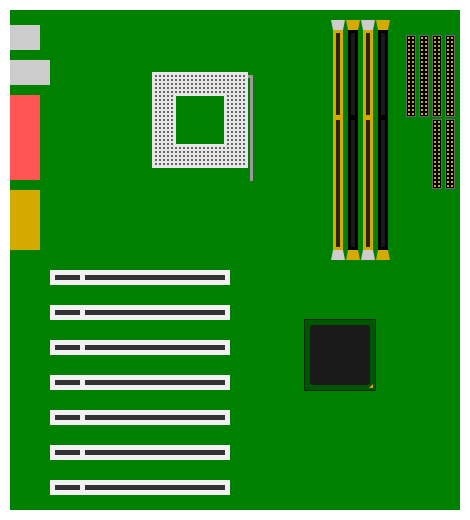 This displays a close-up view of a computer motherboard. The motherboard is green in color and features various components, including multiple chips and wires. There are several squares on the board, which may represent different parts or functions within the system. Additionally, there are two small circles located near the center of the board, possibly representing memory or other essential components. Overall, this image provides a detailed look at the intricate workings of a computer motherboard.