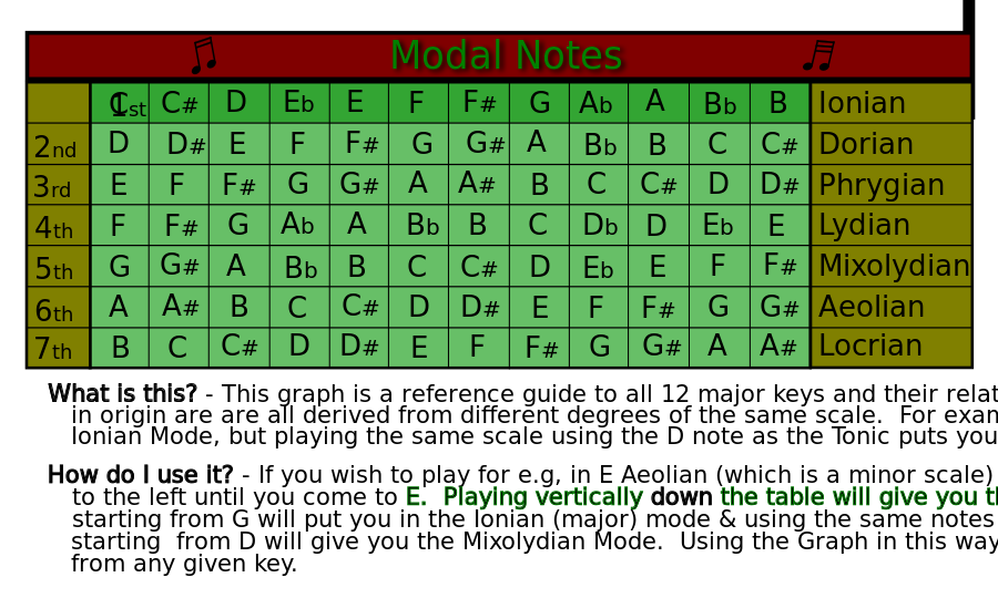 This displays a table with various musical notes and modes. There are twelve different modes listed, including Dorian, Phrygian, Lydian, Mixolydian, Aeolian, and others. Each mode is accompanied by its corresponding note chart, making it easy for musicians to reference the different modes while playing their instruments. The table also includes a reference guide to all twelve major keys and their relation to each other. This helpful tool can be used as a quick reference for musicians looking to understand or play in these specific modes.