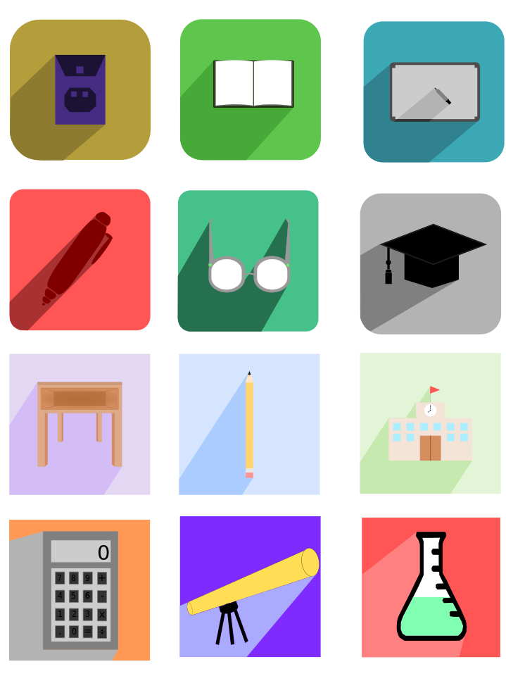 This features a collection of twelve icons, each representing an educational item. These items include a book, pencil, calculator, and several other objects related to learning. Each icon is displayed on a square shape with a different colored background, making the display visually appealing. The icons are arranged in a grid-like pattern, showcasing their variety and organization. Overall, this image effectively conveys an educational theme through its diverse collection of icons.