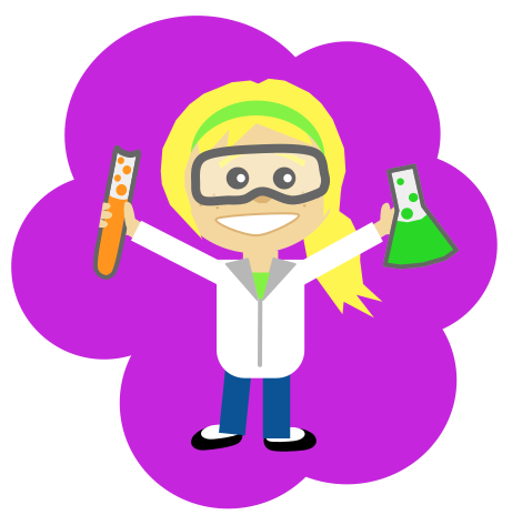 This features a cartoon girl wearing a white lab coat and holding two bubbling test tubes. She is smiling, giving the impression that she enjoys science experiments. In addition to her lab coat, she also has glasses on, which adds to her scientific appearance. The girl appears to be in a purple background, possibly indicating a playful or creative setting for her experimentation.