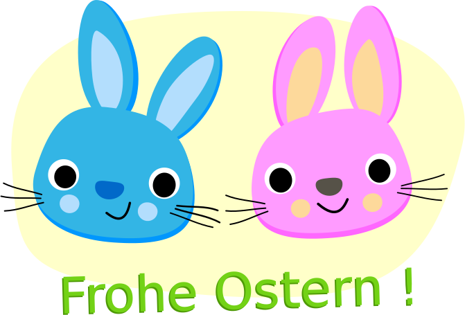 This features two cute bunnies, one in blue and the other in pink. They are both smiling and appear to be enjoying their time together. The bunnies are positioned next to each other, creating a sense of companionship between them. The background is yellow, which adds a cheerful touch to the scene. Overall, it's an adorable image that captures the essence of Easter and the joyous spirit associated with the holiday.