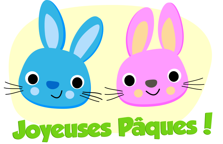 This features two cute cartoon bunny rabbits, one blue and the other pink. They are both smiling and appear to be enjoying themselves. The blue rabbit is on the left side of the image while the pink rabbit is on the right. Above them, there is a caption in green that reads "Joyeuses Pâques!" which translates to "Happy Easter!" in English. This delightful scene likely represents a festive and joyous occasion.