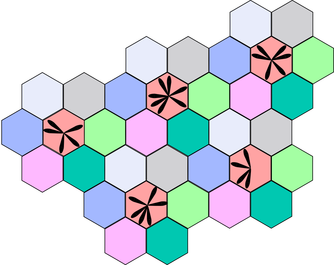 This features a large, colorful hexagonal pattern made up of various shapes and colors. There are numerous circles scattered throughout the design, with some placed in the center while others are located at the edges or corners of the hexagons. The overall effect is an eye-catching and vibrant display that showcases the creativity behind this unique design.