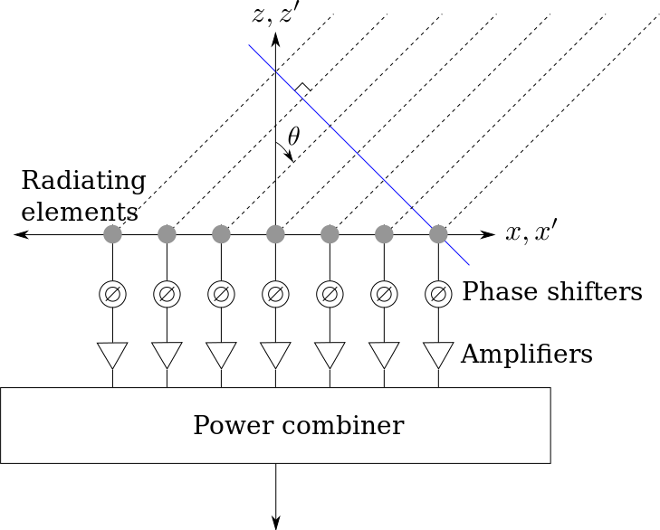 This displays a diagram of an electronic device that combines power and phase shifters. This device is designed to create a linear array, which is essential for various applications such as amplifiers or signal processing systems. The diagram shows multiple elements connected together in a line, with each element contributing to the overall functioning of the system. The image also includes several dots and numbers scattered throughout the diagram, possibly representing specific values or measurements related to the device's performance. These details help to understand the intricate workings of the electronic component and its potential applications in various industries. The combination of power and phase shifters is crucial for maintaining a stable and accurate output signal, making it an essential part of many modern technologies.