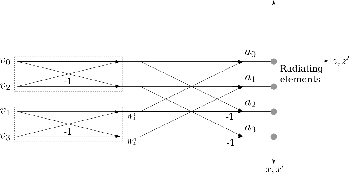 This displays a diagram of a beamforming system using FFT. It shows the process of radiating elements and their corresponding numbers, with each element labeled with its corresponding number. The diagram is divided into several sections, including one that reads "radiating elements" and another that reads "Q1 elements." This complex diagram illustrates the intricate workings of a beamforming system using FFT technology.