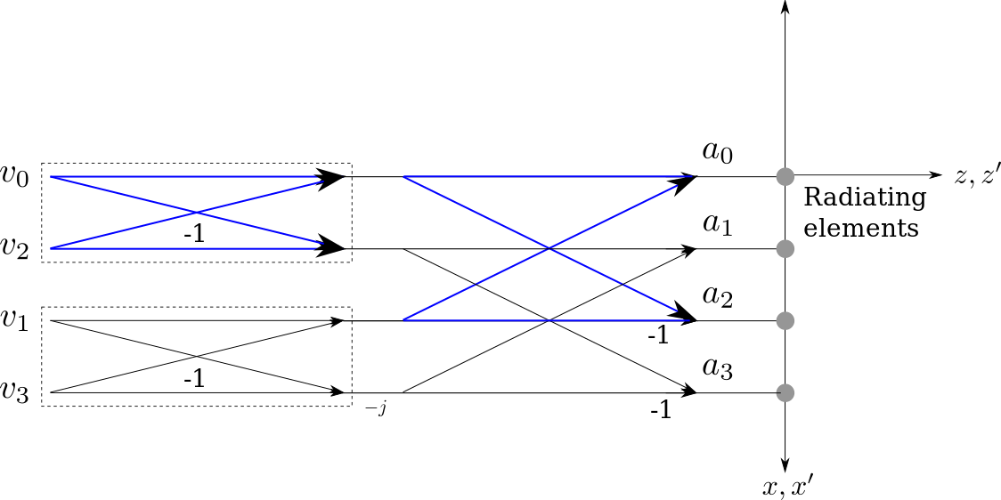 This displays a diagram of a beamforming system using FFT. It shows the process of radiating elements and their corresponding Q-values. There are multiple lines connecting different points on the graph, indicating various stages in the process. The diagram is labeled with numbers and letters to provide clear information about each step. This visual representation helps explain the concept of beamforming using FFT, making it easier for viewers to understand the underlying principles.