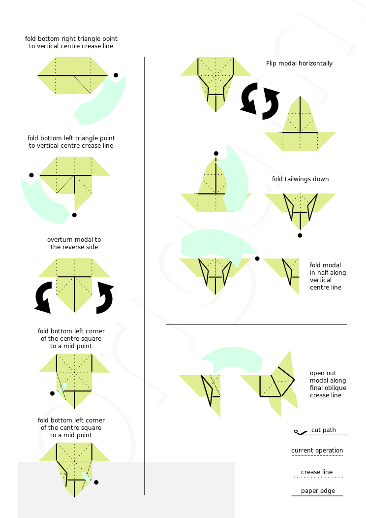 This is a diagram showing the process of creating a paper butterfly. It consists of several steps, starting with a square and ending up with a finished butterfly shape. Alongside each step, there are labels describing what is happening in that particular stage of the process. The diagram is colorful, featuring yellow as the main color for the butterfly. This visual guide helps to understand how the paper butterfly is made, from its initial square form to its final intricate shape.