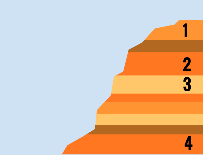 This features a large, multi-layered structure made of orange and brown colored rocks. These layers are arranged in a pyramid shape, with each layer stacked on top of the other. There are four distinct layers visible in the image, indicating that it is likely an artistic representation or model of some kind. The background of the image is a striking blue color, which contrasts beautifully with the warm tones of the rocks and their arrangement.