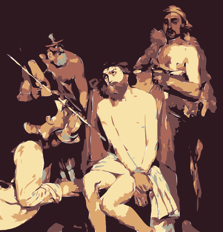 This is a black and white drawing of Jesus being mocked by two men. One man is holding a whip, while the other has a bow and arrow. They are both standing over Jesus who appears to be naked. In addition to these three figures, there are several other people in the scene, some of whom are also naked. The drawing captures the emotions and actions of the individuals involved in this historical event.