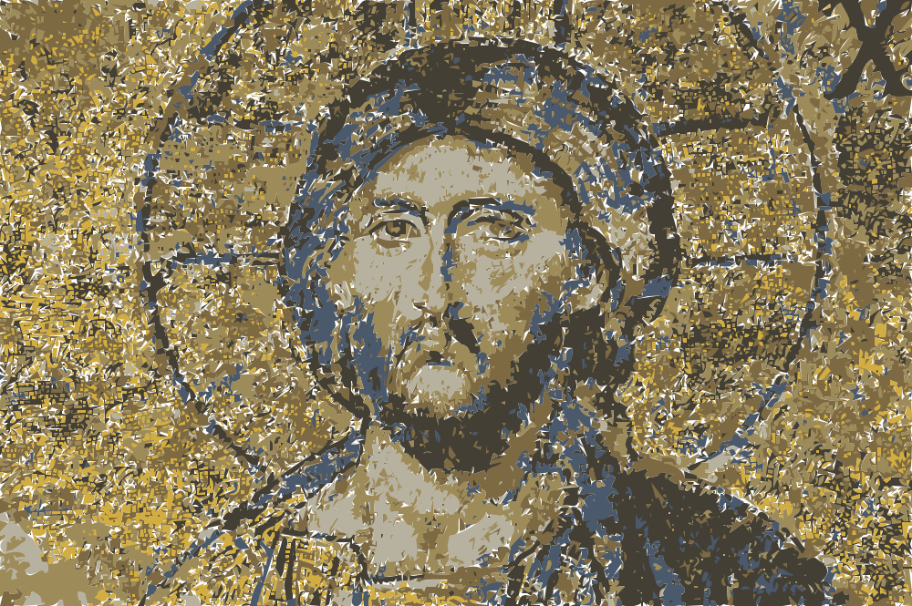 This features a mosaic of Jesus Christ, with the face being in black and white. The background is yellow, giving it an old-fashioned appearance. The mosaic is quite detailed, showcasing the facial features of Jesus, including his eyes, nose, mouth, and beard. The image has a vintage feel to it, making it appear as though it was taken many years ago.