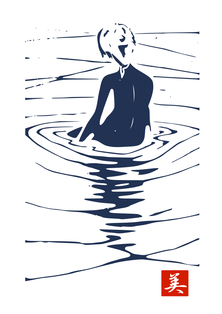 This features a person, possibly a woman or a girl, sitting in the water. She appears to be enjoying her time as she sits on top of the water. The scene is depicted with black and white colors, giving it an oriental feel. The person's body is visible from the waist up, and they seem to be looking at something or someone else in the distance. The image has a sense of tranquility and serenity as the person takes a moment to relax in the water.