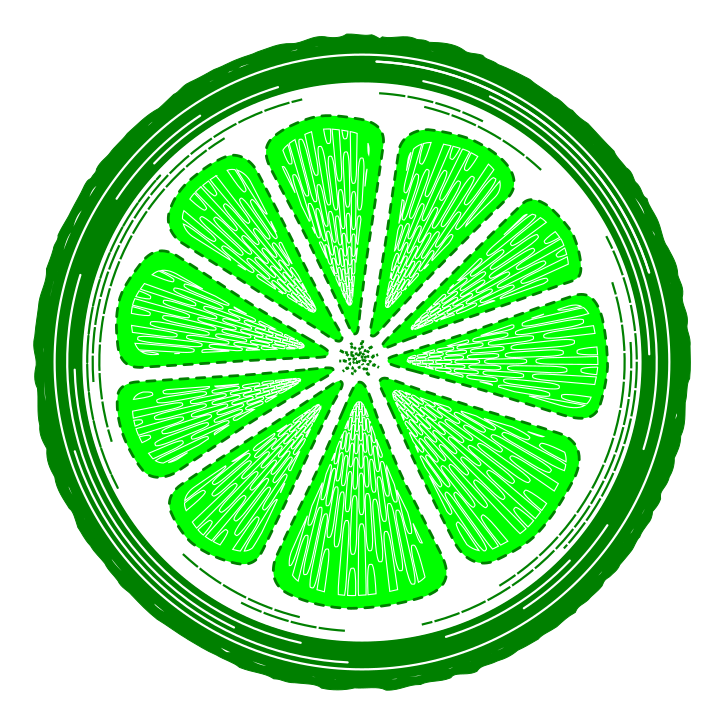 This features a green lime slice that is outlined with darker shades of green. It appears to be a close-up view of the fruit, showcasing its vibrant color and texture. The lime slice seems to be placed in a circular frame or border, which adds an artistic touch to the presentation. This creative display could be used for various purposes such as advertising, decoration, or even as a unique way to present food items.