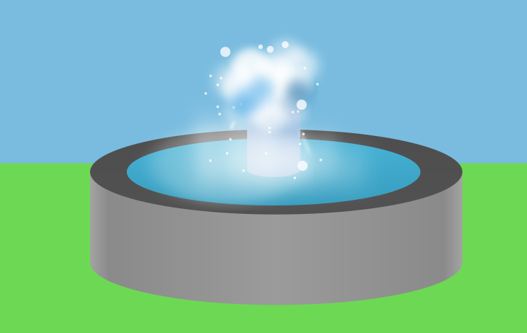 This features a small, round pool of water with a fountain in the middle. The water is blue and appears to be sparkling as it flows from the fountain. The scene takes place on a grassy field, giving the impression that this could be an outdoor setting or park. The combination of the sparkling water and the lush greenery creates a serene atmosphere in the image.