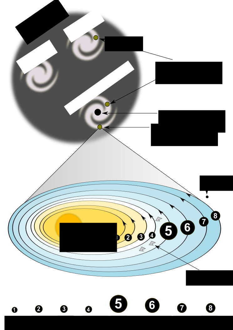 This is a diagram of the solar system, featuring various planets and black holes. Each planet has a corresponding number next to it, making it easy to identify which one you are looking at. There are three black holes in the top part of the image, with each one being labeled with a number. The planets are arranged in a circular formation around these black holes, creating an interesting visual representation of our solar system.